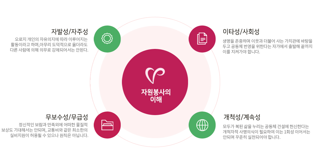 자원봉사활동 기본법 제3조에 의거 개인 또는 단체가 지역사회·국가 및 인류사회를 위하여 대가 없는 자발적으로 시간과 노력을 제공하는 행위입니다.